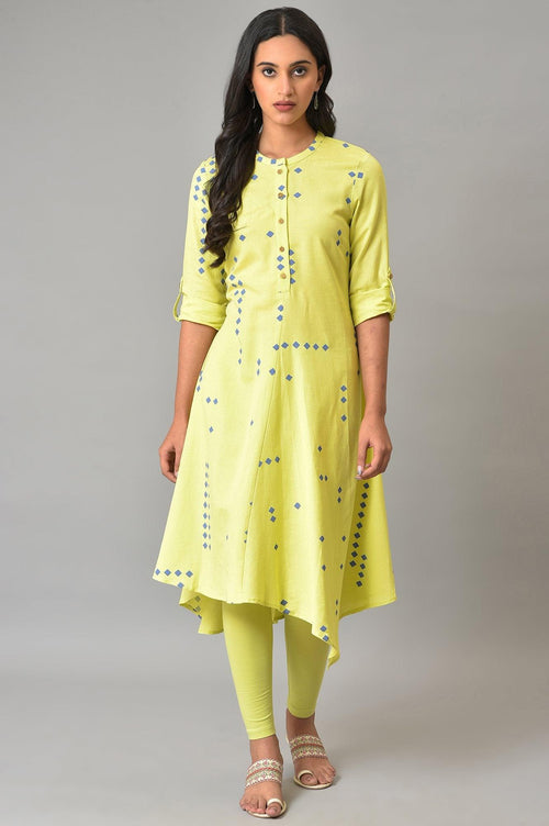 Celery Green Asymmetric kurta In Geometric Print