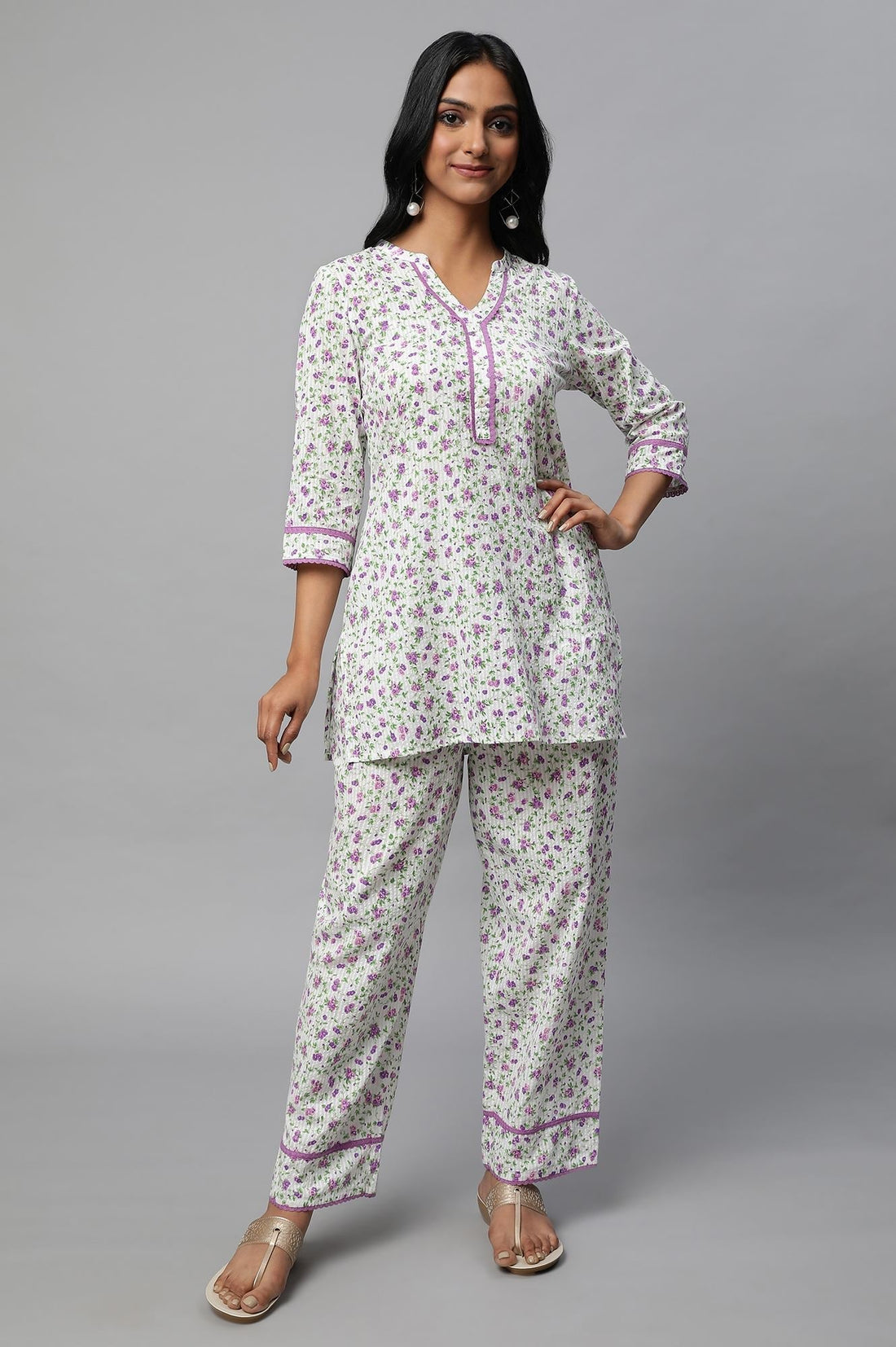 This Is A Floral Printed Co-Ord Set In Seer Sucker Fabric. Its Upperwear Features A Mandarin Collar With V-Opening And A Mock Placket With Contrasting Lace Complemented By Buttons. Its 3/4Th Sleeves Are Accentuated By Lace Details. Pair It Up With Identical Printed Palazzos Having Pockets And Lace Around Bottom Hem To Uplift The Look.