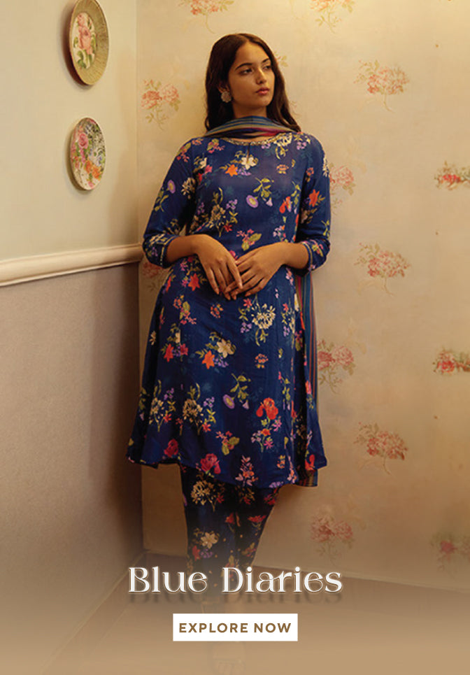 Blue Floral Printed Cotton Kurta, Straight Pants And Dupatta Set- Regular price