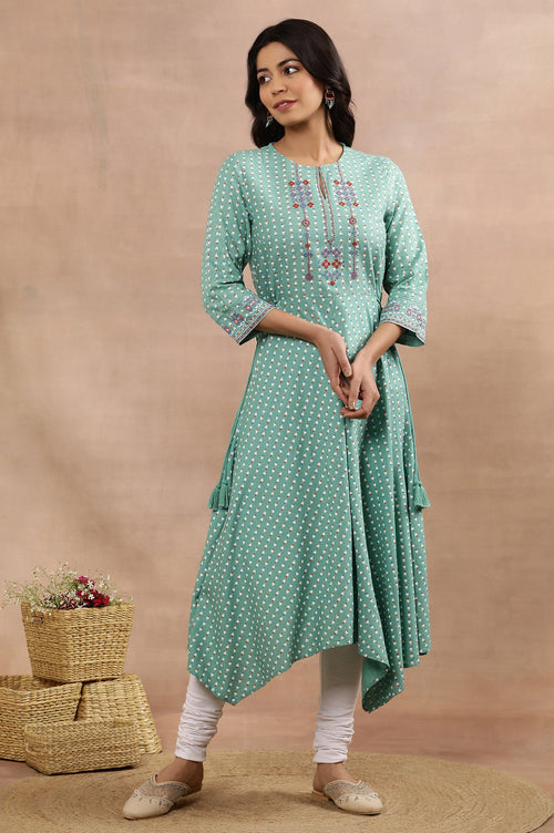 Green Asymmetrical Printed Kurta And Churidar Set