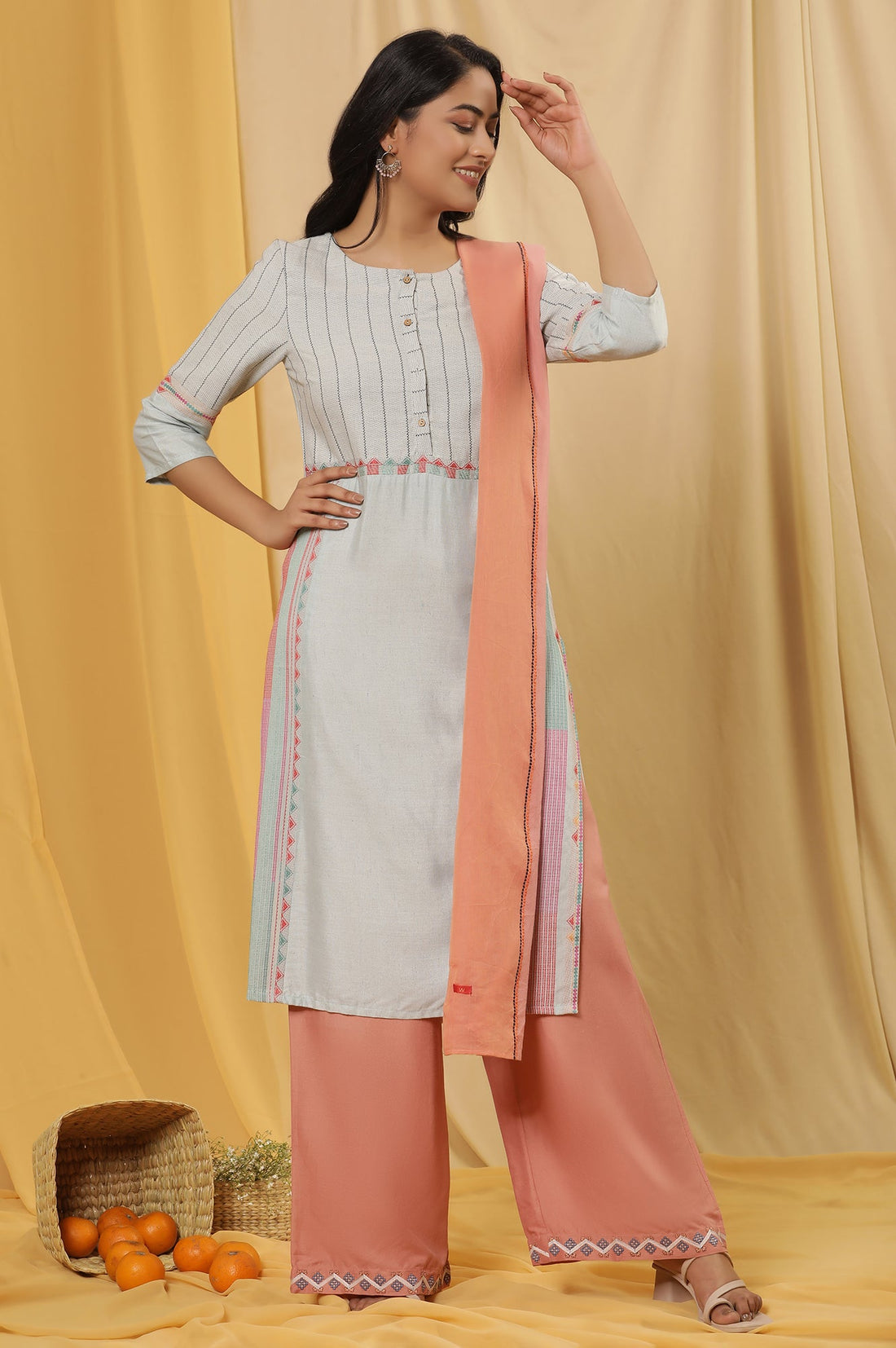 Pale Blue Cotton Dobby Kurta, Parallel Pants And Dupatta Set