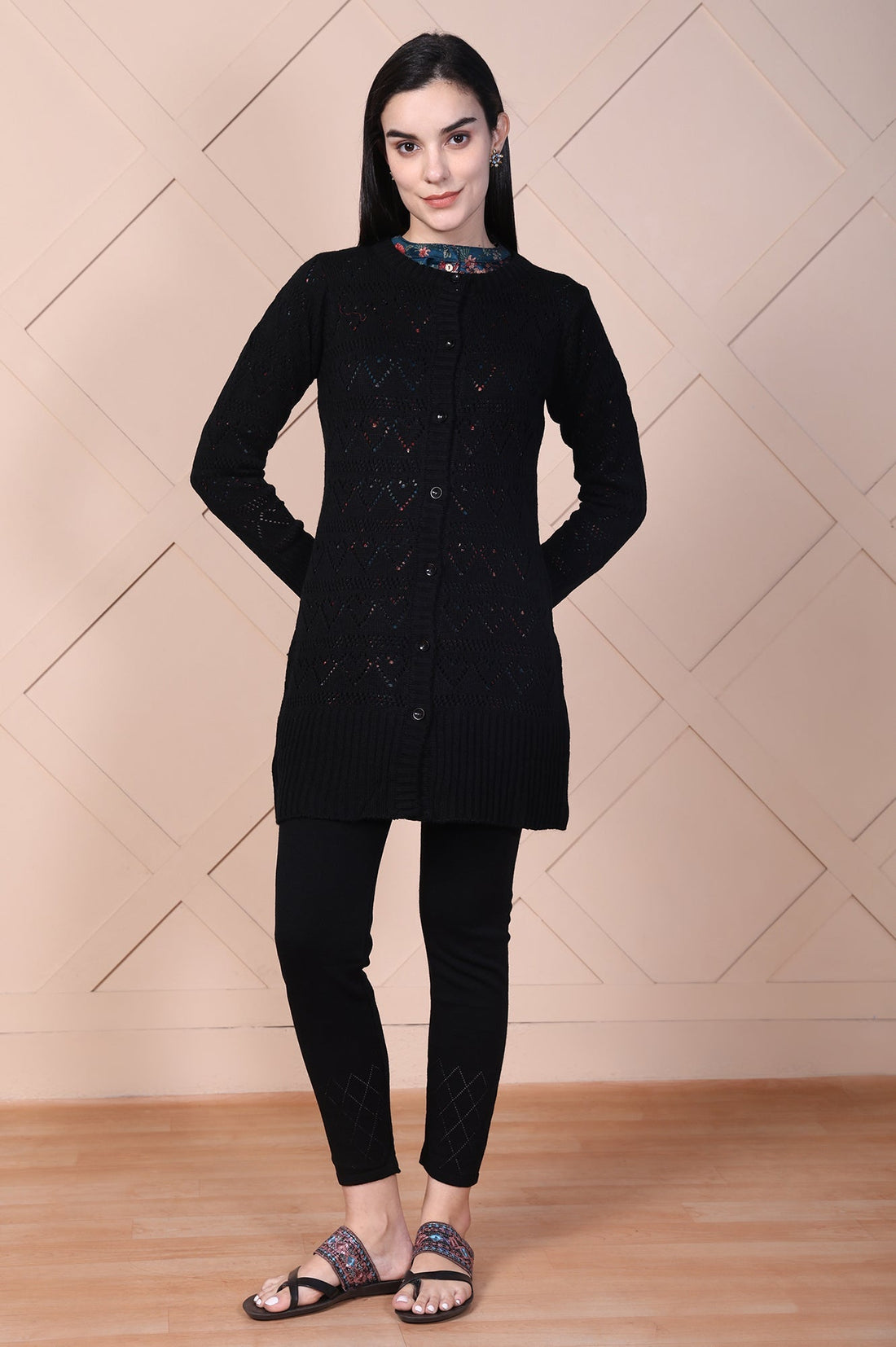 Elevate your winter wardrobe with this black textured cardigan from Aurelia. Featuring a geometric knit pattern and a straight silhouette, it’s designed for both style and comfort. The button-front closure and long sleeves make it perfect for layering over casual or ethnic outfits, ensuring warmth and elegance during chilly days.