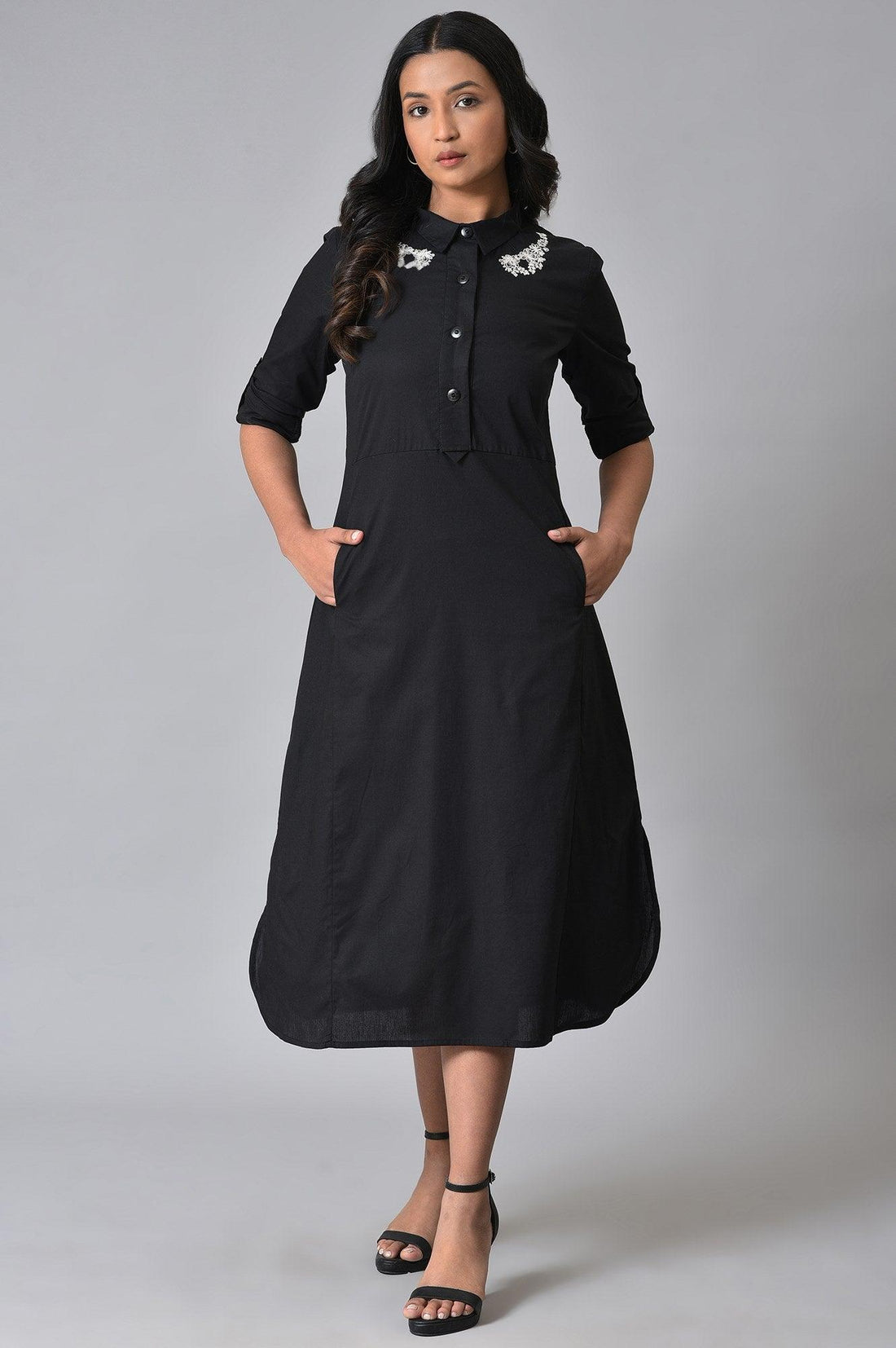 Step into fusion fashion with this exquisite black dress that seamlessly blends traditional and modern elements. Perfect for casual outings, this woven dress features intricate embroidery that adds a touch of elegance to its design. The spread neckline and three-quarter sleeves offer a flattering silhouette, while the A-line cut ensures a comfortable and stylish fit. Crafted from 100% pure cotton, this dress promises both comfort and durability. The fusion style makes it versatile enough to be dressed up or down, depending on the occasion. Whether worn with heels or flats, this embroidered dress is sure to turn heads and become a staple in your wardrobe.