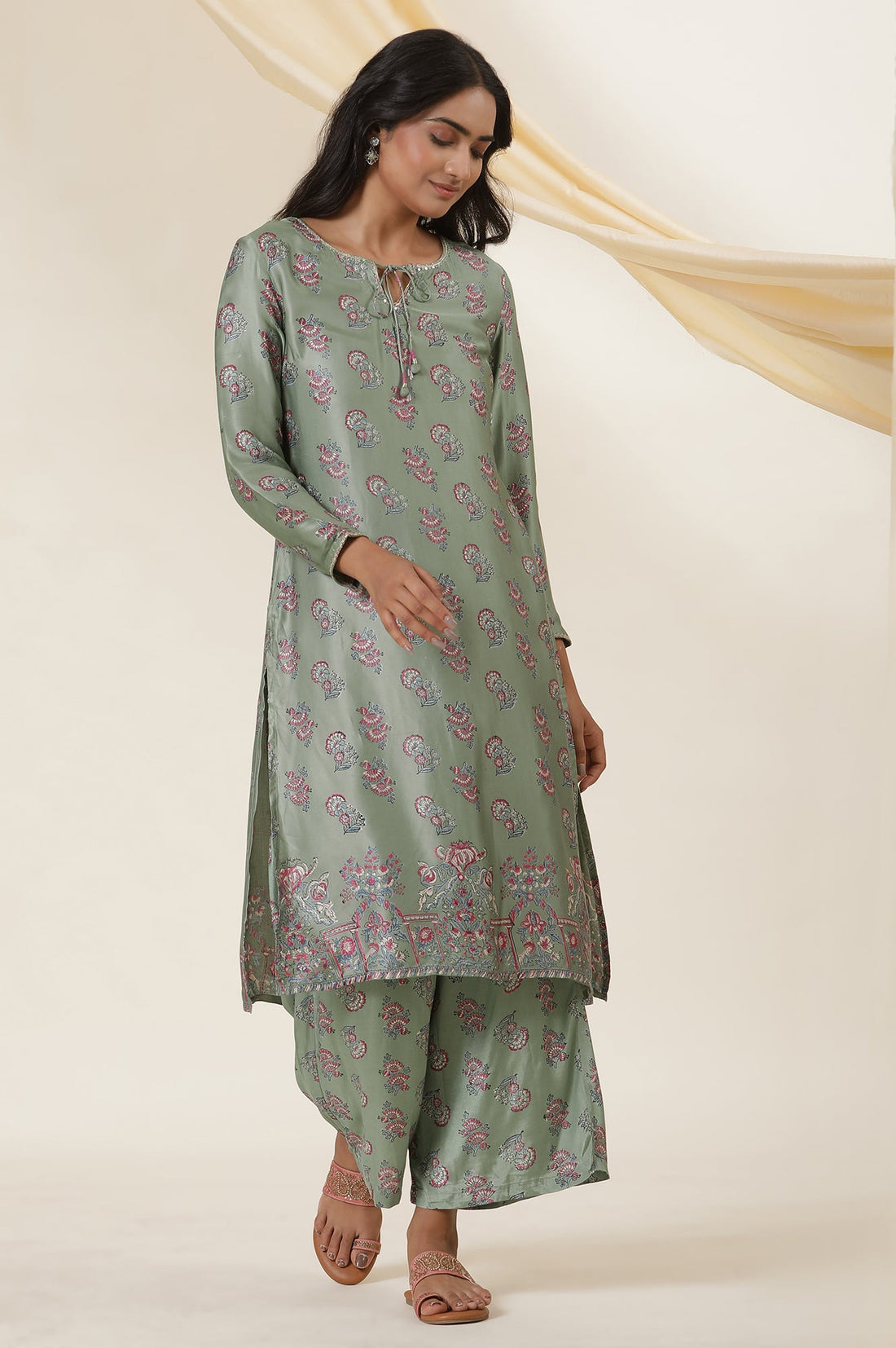 A Floral Hand Block Print Kurta With A Keyhole Detail At Neck Crafted In Fluid Modal Satin Fabric, Features Border Placement At Hem. Neck Is Further Accented With An Interesting Zari And Mirror Work Embroidery With A Tie-Up.