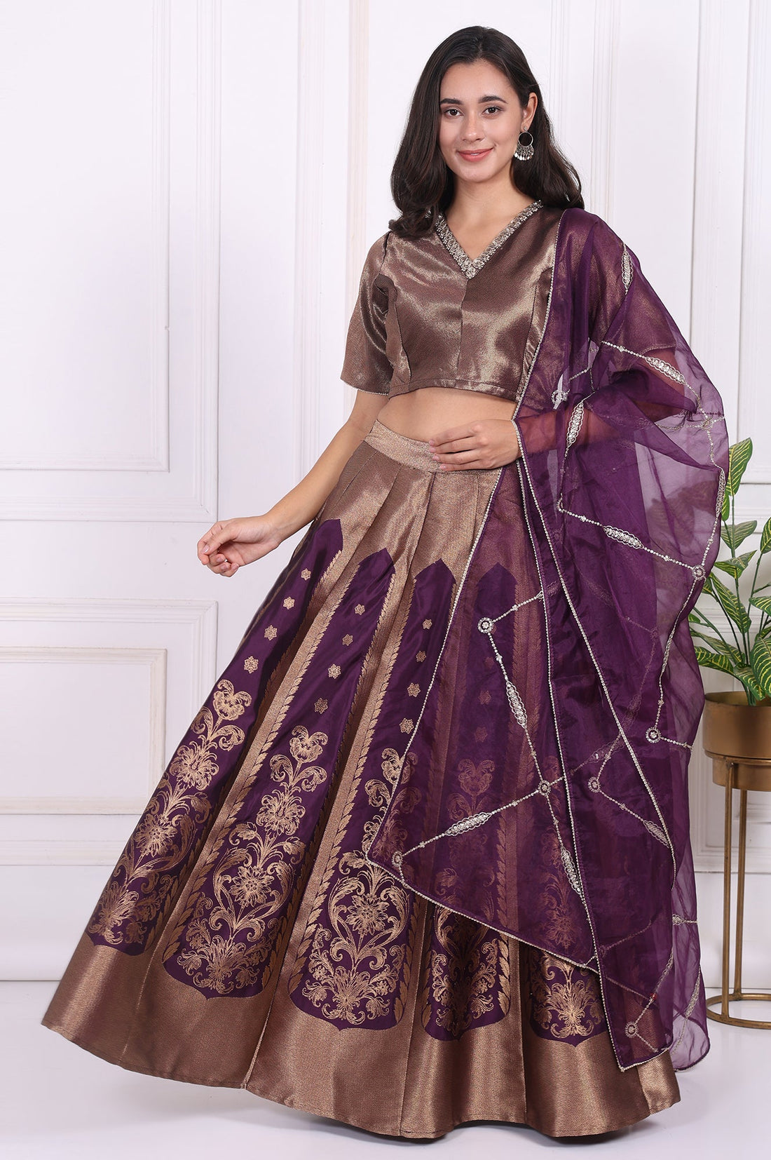 Purple Embellished Jacquard Straight Crop Top, Skirt and Dupatta Set