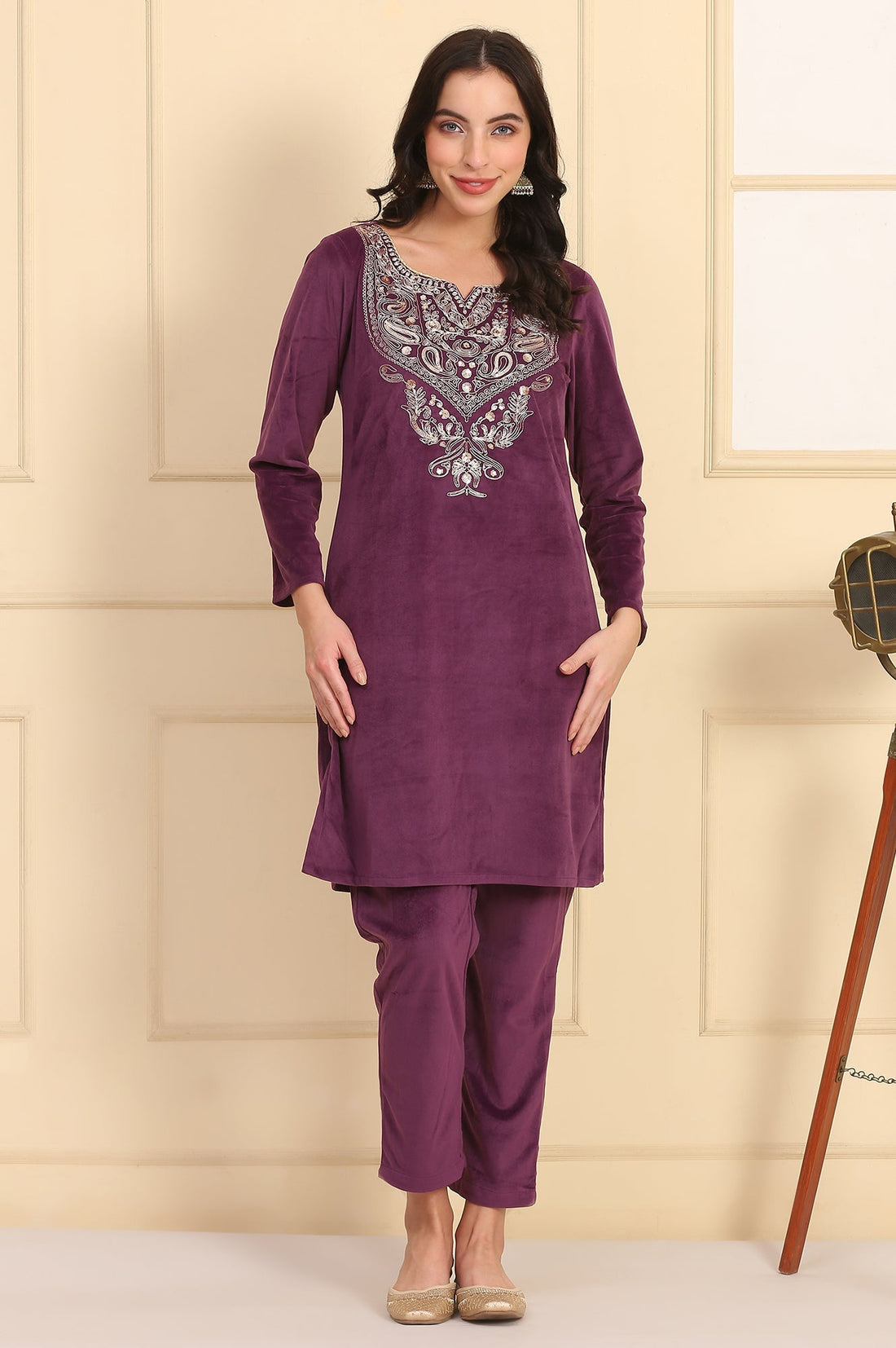 Discover contemporary elegance with this embroidered yoke purple winter kurta by Aurelia, designed for the modern woman who appreciates refined ethnic styling. This sophisticated ensemble features a straight-cut kurta with beautiful embroidered detailing and coordinating bottoms. The round neckline and full sleeves create a classic silhouette, while the intricate embroidery work adds artistic flair to the solid purple base. Crafted from premium knit fabric, this set ensures exceptional comfort and flexibility throughout the day. The waist-length kurta paired with mid-rise bottoms creates a balanced and flattering proportion. The slip-on styling offers convenience for busy lifestyles, while the rich purple colour adds depth and sophistication to your ethnic wardrobe. This winter kurta set seamlessly blends traditional embroidery techniques with contemporary design elements, making it perfect for casual and semi-formal occasions.