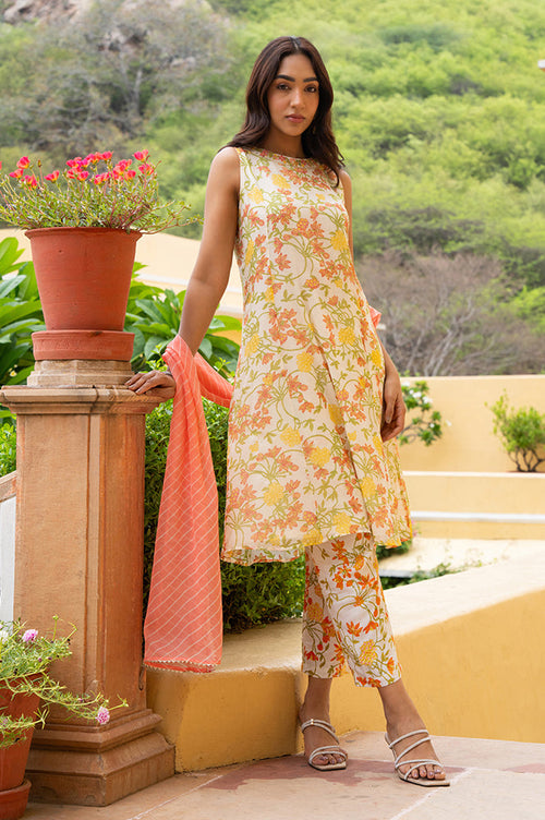 Crafted In Chiffon, This A-Line Kurta Set Is A Must-Have For An Elevated Look. It Is Adorned With Floral Print All-Over And Has Thread Work On Neckline. This Sleeveless Kurta Includes Printed Straight Pants And Leheriya Printed Contrast Drape.